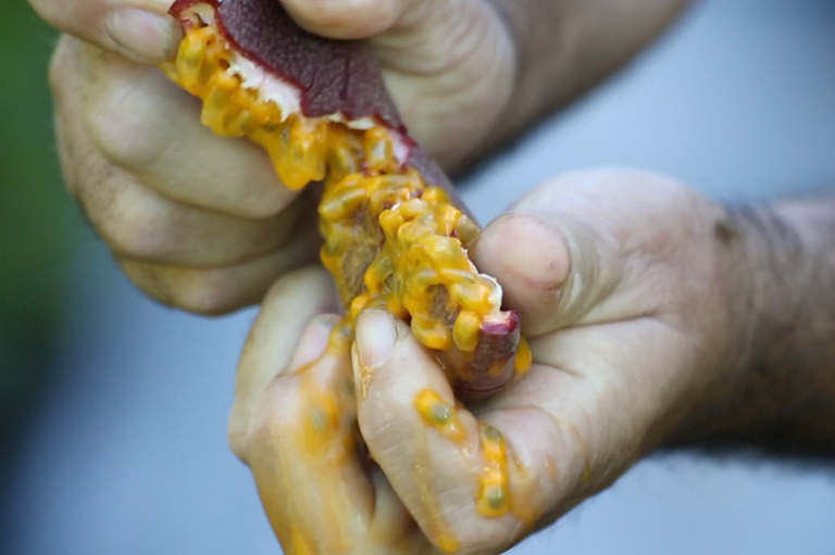 They have always used outdoor, organic farming methods because they believe in this model and would not consider doing it any other way. The passion fruit plant can flower and bear fruit simultaneously, so at the same time we can find fruit to harvest, beautiful flowers full of pollinators and small, newly formed passion fruits that are beginning to grow.