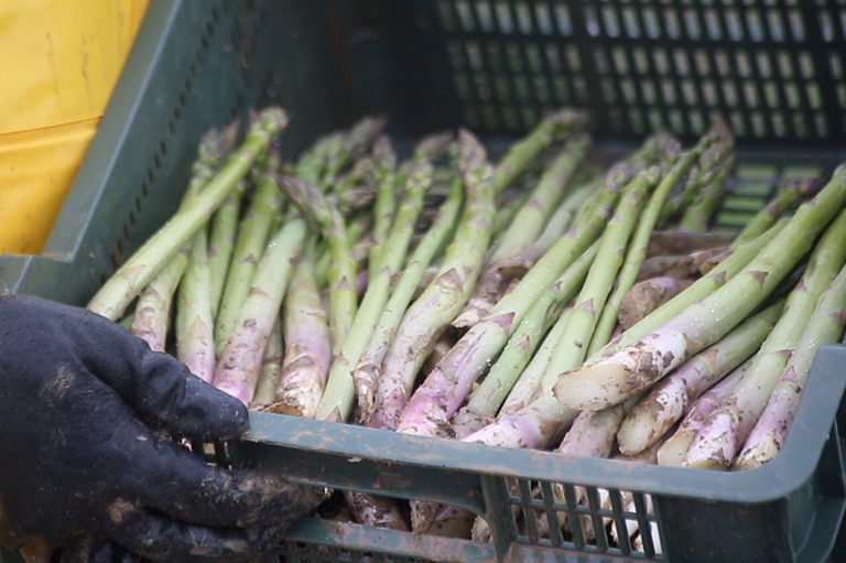 Paco has a broader vision of agriculture and how to relate to the land and people. His grandfather worked with respect for the land, and his father’s era was one of agricultural intensification. Paco started with organic asparagus, then moved on to olive trees, and now wants to continue with almond trees. He cultivates two hectares of asparagus, one of which is organic. Green and purple asparagus are harvested twice a year, 400-500 kg in spring and a smaller amount in October. Everything is done by hand with the help of workers from the colonial village of Algallarín.